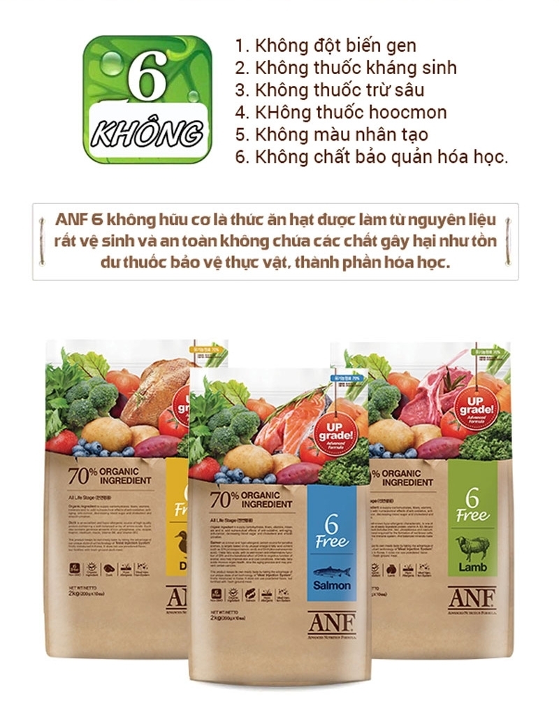 Đây là sản phẩm hạt HỮU CƠ của thương hiệu ANF ( thành phần hữu cơ lên đến 95%) dành cho chó từ 6 tháng tuổi trở lên.