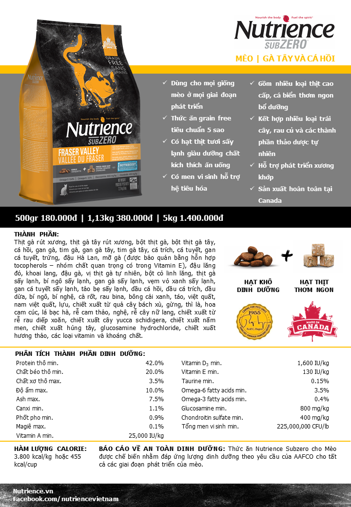 Sản phẩm Nutrience Subzero Fraser Valley cho Mèo sử dụng các nguồn nguyên liệu tự nhiên tươi sống của Canada như thịt gà tây, thịt gà cao cấp Canada, heo rừng, cá biển đại dương và hạt thịt gà tươi sấy lạnh để cho ra hương vị tuyệt hảo có thể khiến cho những chú mèo cưng khó tính nhất cũng phải thèm ăn.