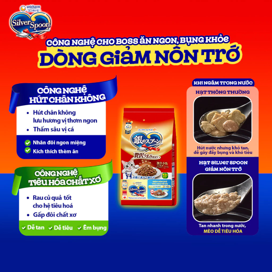 Với kích thước hạt thức ăn nhỏ chỉ 0.8cm, áp dụng thêm công thức Fiber-Digest độc quyền từ Nhật Bản, món ăn không chỉ ngon từ bên trong mà còn tan nhanh, dễ tiêu hóa khiến mèo cưng của bạn thích thú khi thưởng thức món ăn.