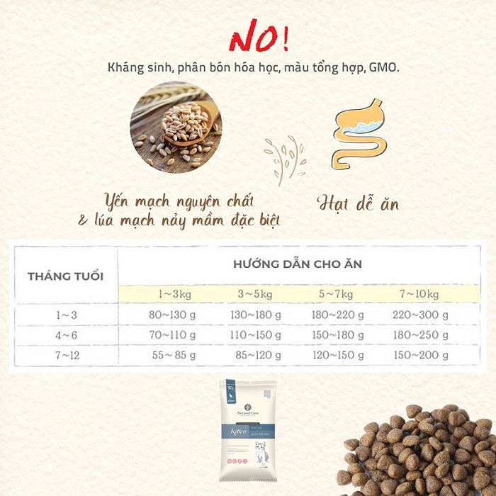 Thức ăn hữu cơ cho mèo con Natural Core Bene Kitten cung cấp nguồn protein đa dạng từ thịt gà tươi và cá hồi giúp mèo con phát triển toàn diện trong khoảng thời gian đầu đời.