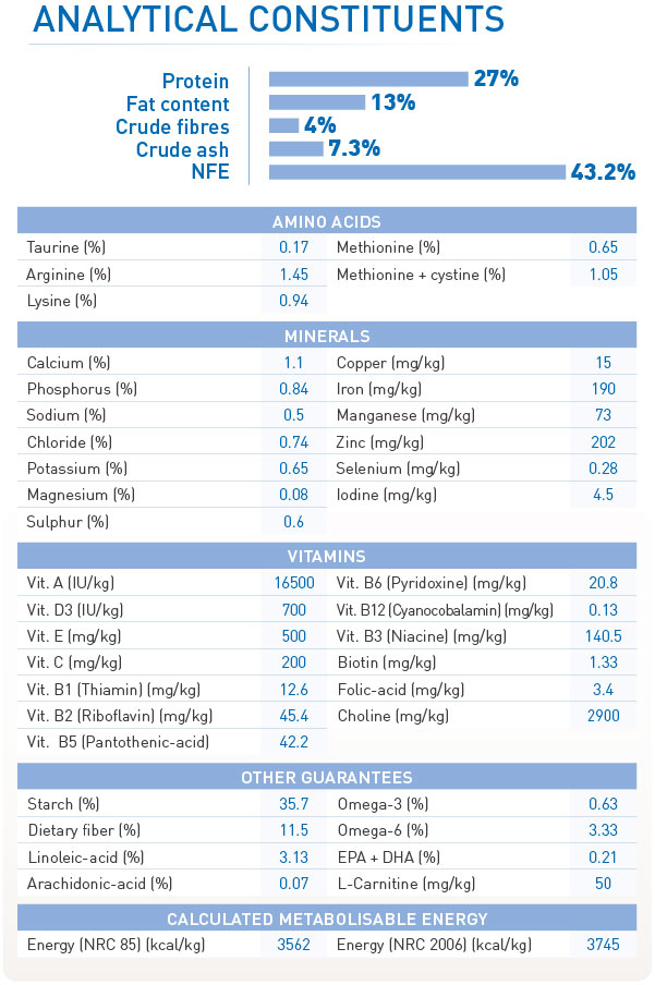 Protein gia cầm, gạo, lúa mì, bắp, protein thực vật*, chất béo động vật, bột lúa mì, xơ thực vật, củ cải đường, men, dầu đậu nành, khoáng chất, fructo-oligo-sacarit, dầu cá, psyllium (0,5%).