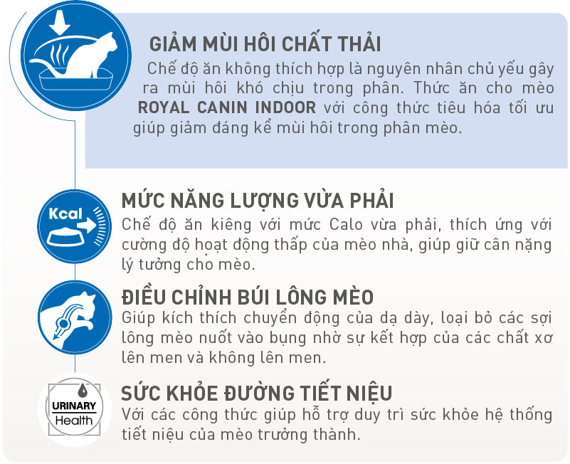 Thức ăn cho mèo ROYAL CANIN Indoor hỗ trợ sức khoẻ của mèo bằng cách cung cấp dinh dưỡng chính xác dựa trên sự hiểu biết đúng đắn về các nhu cầu cụ thể với hơn 40 năm nghiên cứu. Mèo sống trong nhà có lối sống ít vận động, nhu cầu năng lượng thấp hơn và nguy cơ béo phì cao hơn nên thức ăn cần hỗ trợ được những vấn đề sau: